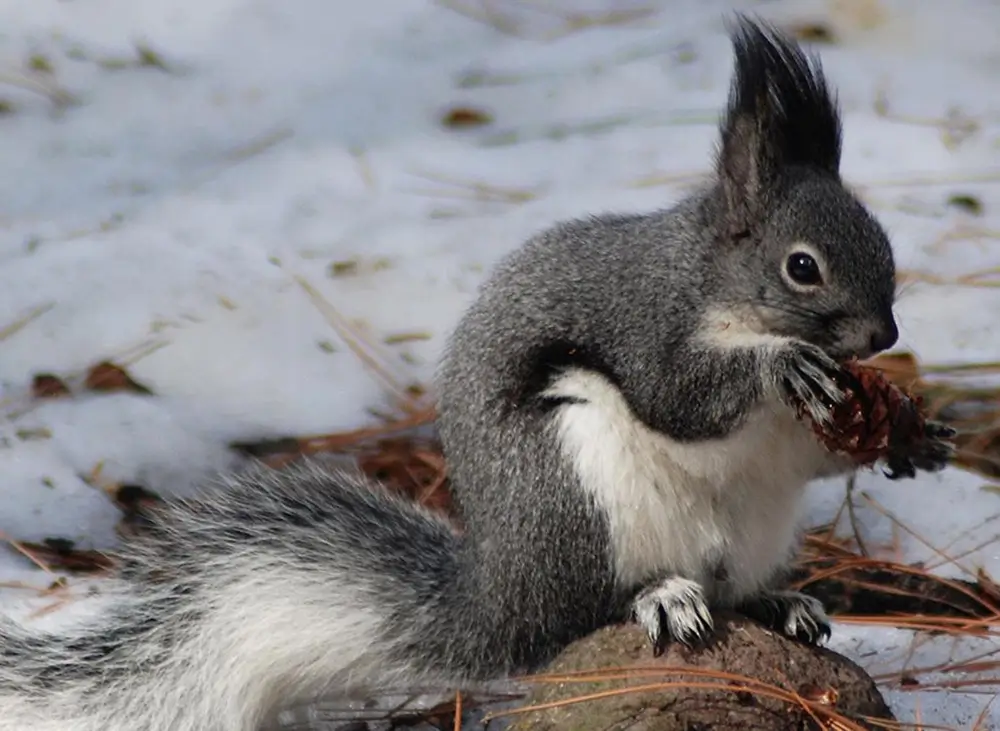Abert’s squirrel eats ponderosa pine seeds by holding the pinecone, turning it, and eating the seeds – like you would hold and eat an ear of corn.