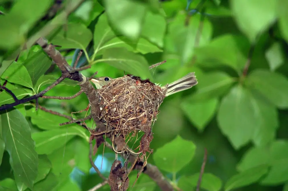 The female lays 2-4 eggs in an open cup nest woven of plant fibers and placed in a bush or tree, sometimes over a stream. The chicks hatch in two weeks and fledge when they are 13-15 days old. The female may have two broods a year.