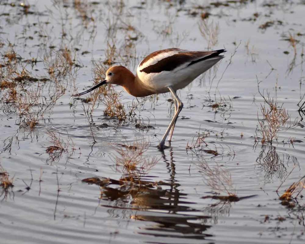 The American avocet lives in freshwater marshes and shallow marshy lakes. It breeds in salt or brackish marshes. It may move to coastal areas in the winter.