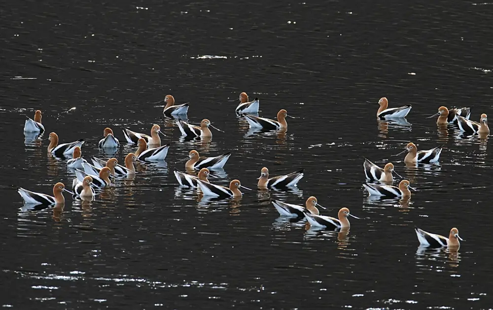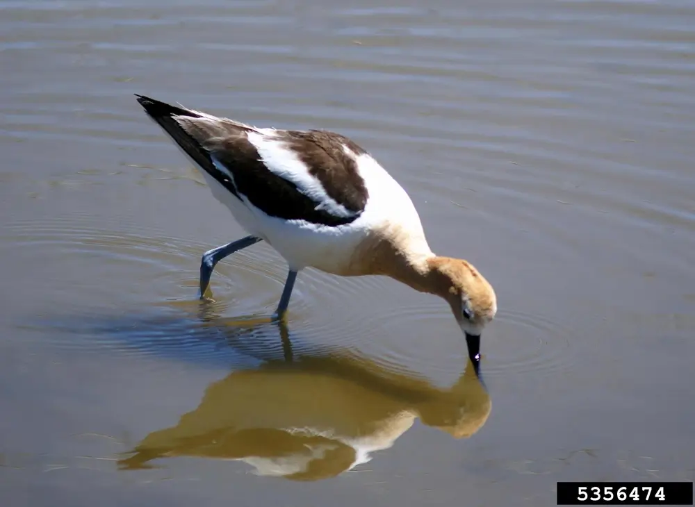 The American avocet moves its bill back and forth on the surface of the water to stir up insects, crustaceans, and other food.