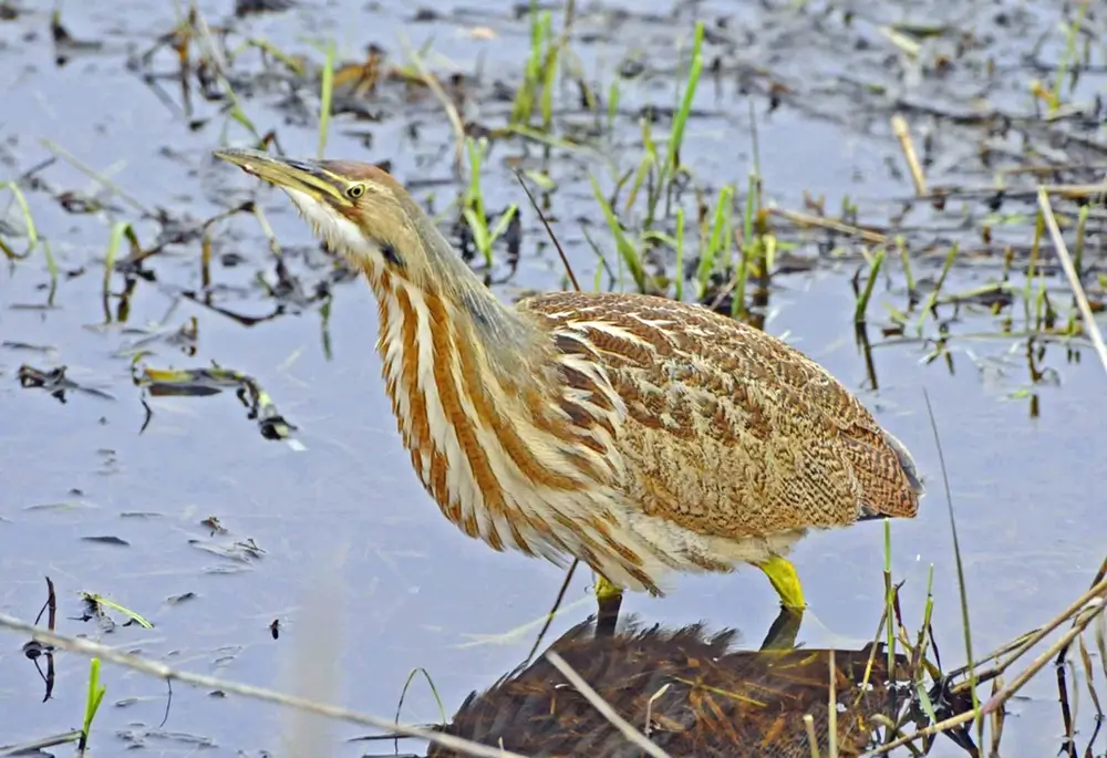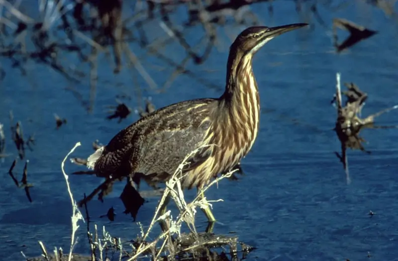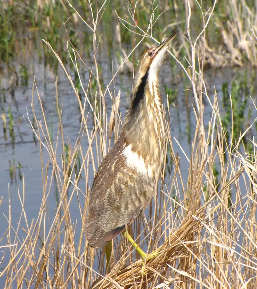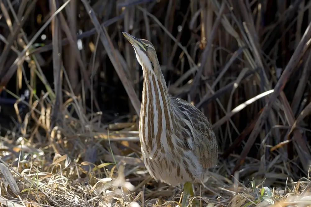 The American bittern relies on camouflage coloration to protect itself from predators. It spends most of its time hidden in the reeds. When a threat approaches, it either freezes in place or stretches its neck up toward the sky and sways back and forth.