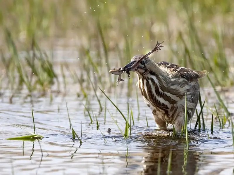 The American bittern eats small fish, eels, small snakes, salamanders, insects, frogs, crayfish, and small mammals. It stands still in the water and waits for its prey. When it spots something, it quickly goes after it and catches it in its bill. It then swallows its catch whole.