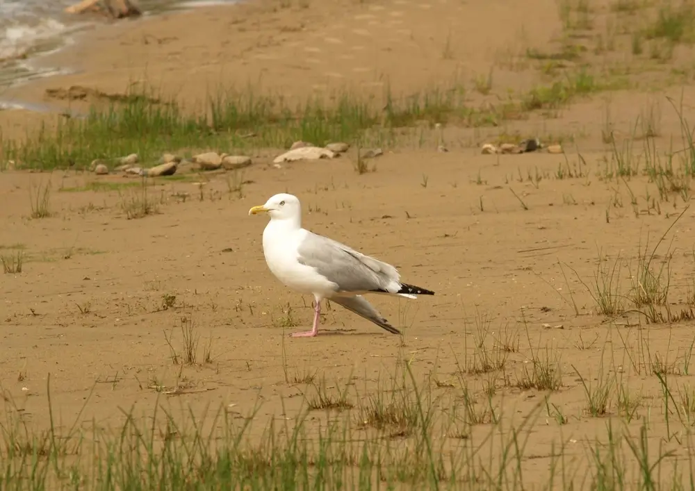 The herring gull is found on islands, beaches, mudflats, fields, meadows, golf courses, beside lakes and rivers, in the grassy areas of airports, and in landfills.