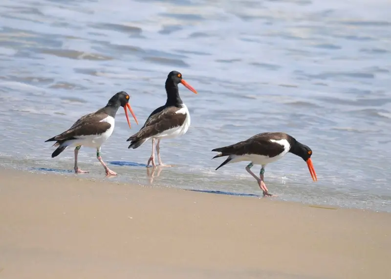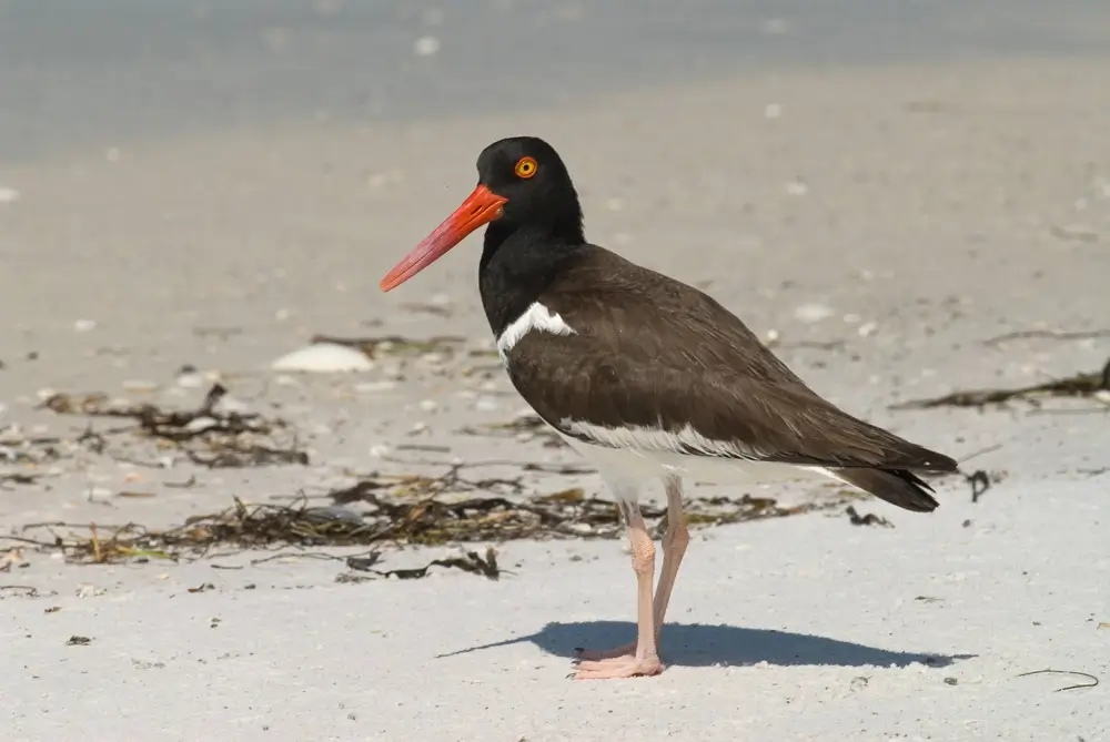 The American oystercatcher uses its long bill to pry open mussels, oysters, and other bivalves. They snap the adductor muscles of the bivalves with their long bill so the shell can’t close up.