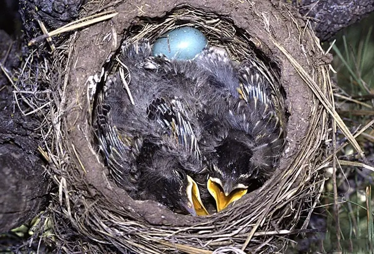 The nest is built 5-15 feet (1.5-4.6 m) above the ground in a tree or bush. Sometimes a robin builds its nest on a window ledge. The female lays two to five light blue eggs. The female incubates the eggs for about two weeks. Once the chicks hatch, the male and the female feed and care for them.