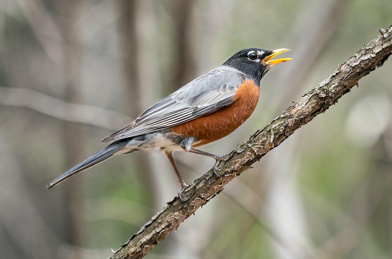 The male robin uses its voice to protect its territory and to attract a mate. It is often one of the first birds heard in the spring.