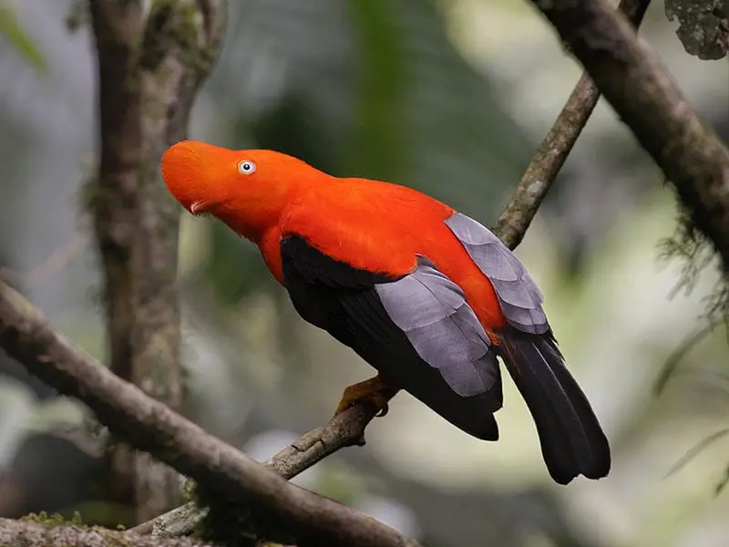 The Andean cock-of-the-rock is found in cloud forests in the Andes Mountains in Colombia, Venezuela, Ecuador, Peru, and Bolivia.