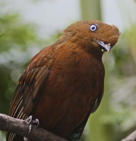 The male Andean cock-of-the-rock has a bright red-orange head, neck, breast, and shoulders. It has a black body, gray wings, and a large disk-shaped crest of feathers that extends over its bill. The female is brownish-orange and has a smaller crest.