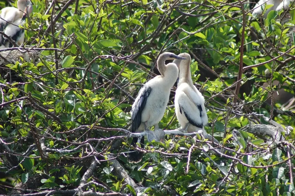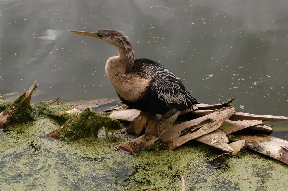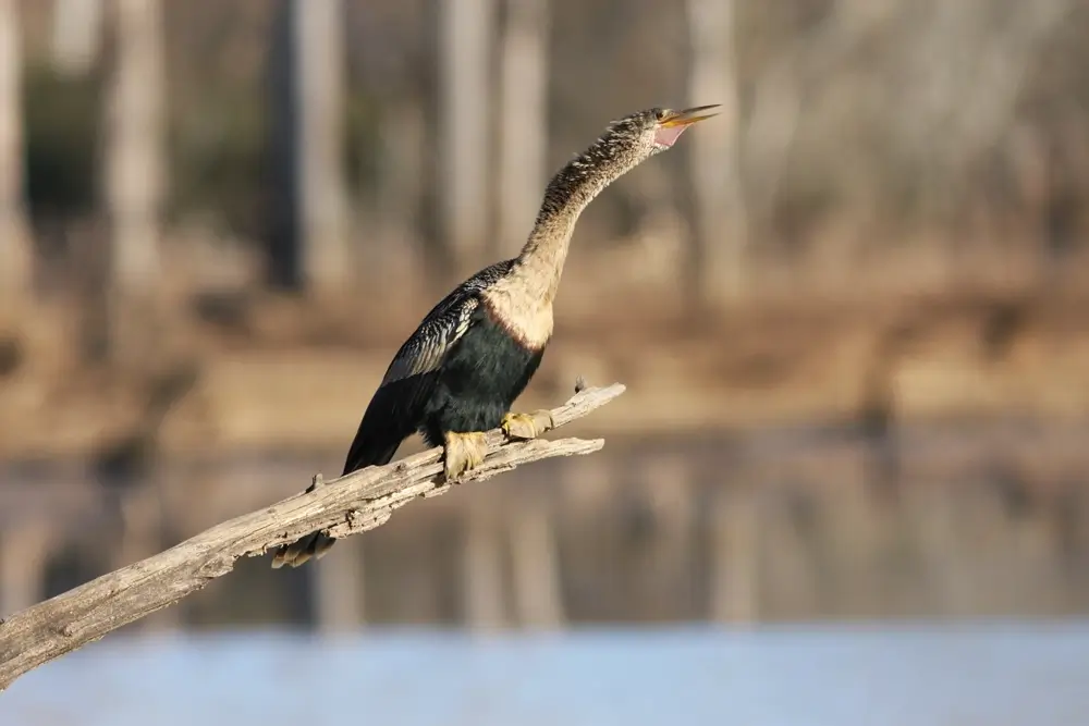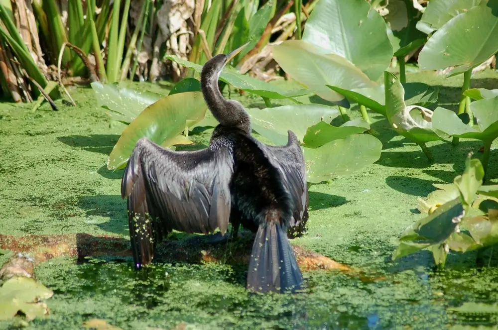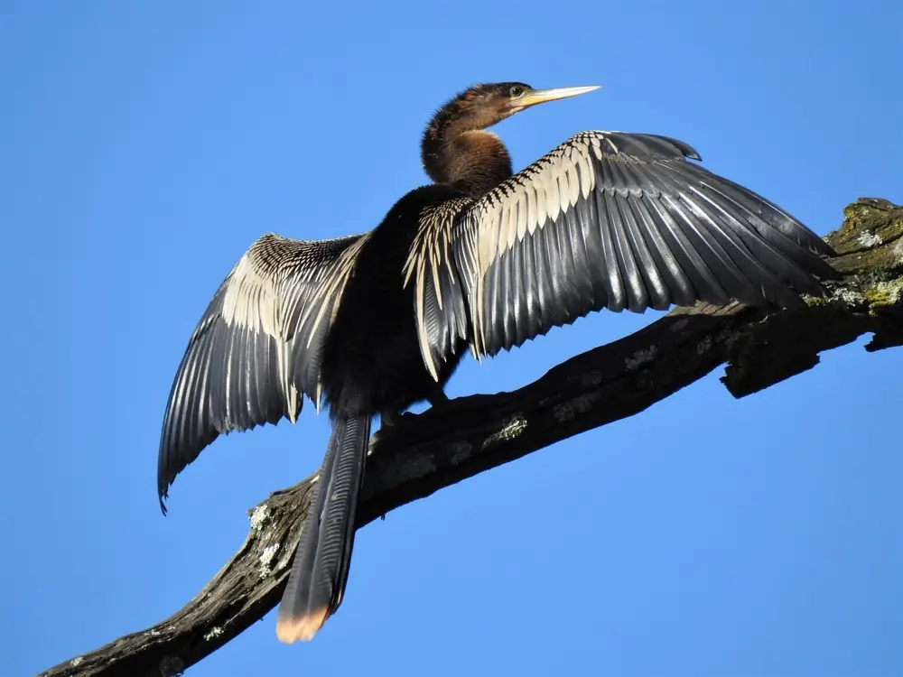 The anhinga has poorly developed oil glands, and its feathers aren’t as waterproof as the feathers of other water birds. It perches in a tree with its wings open to dry its feathers and warms its body.