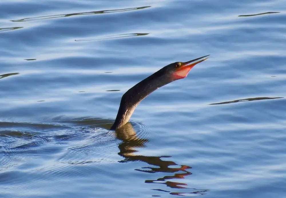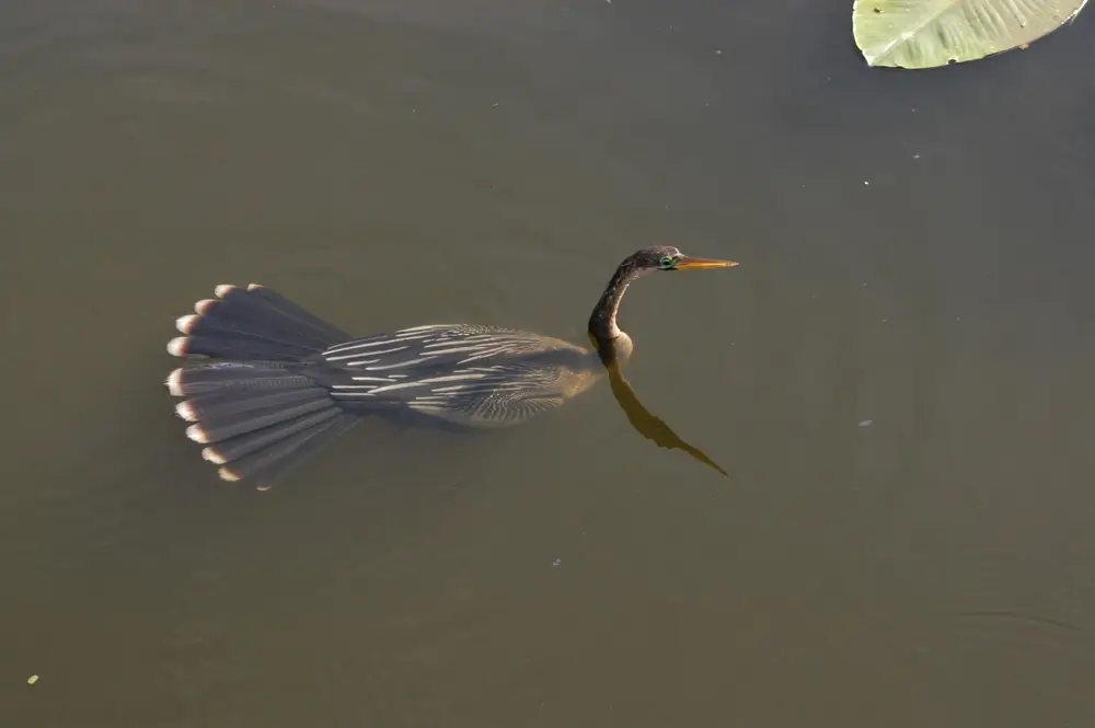 The anhinga is also known as the snakebird. When it swims, its body is submerged under the water. It stretches its head and neck flat out on the surface of the water. When its head and neck are stretched out, it looks like a snake is gliding through the water.