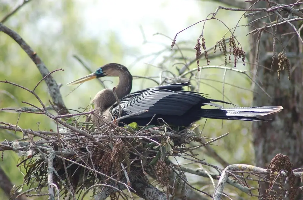 The male anhinga courts the female by flying and gliding overhead. The male chooses a nesting site. Once a pair has formed, the male gathers sticks, leaves, and twigs for the nest. The female uses the materials the male gathers to build a platform nest in a tree. The nest is built 4-20 feet (1.2-6.1 m) above the ground or water.