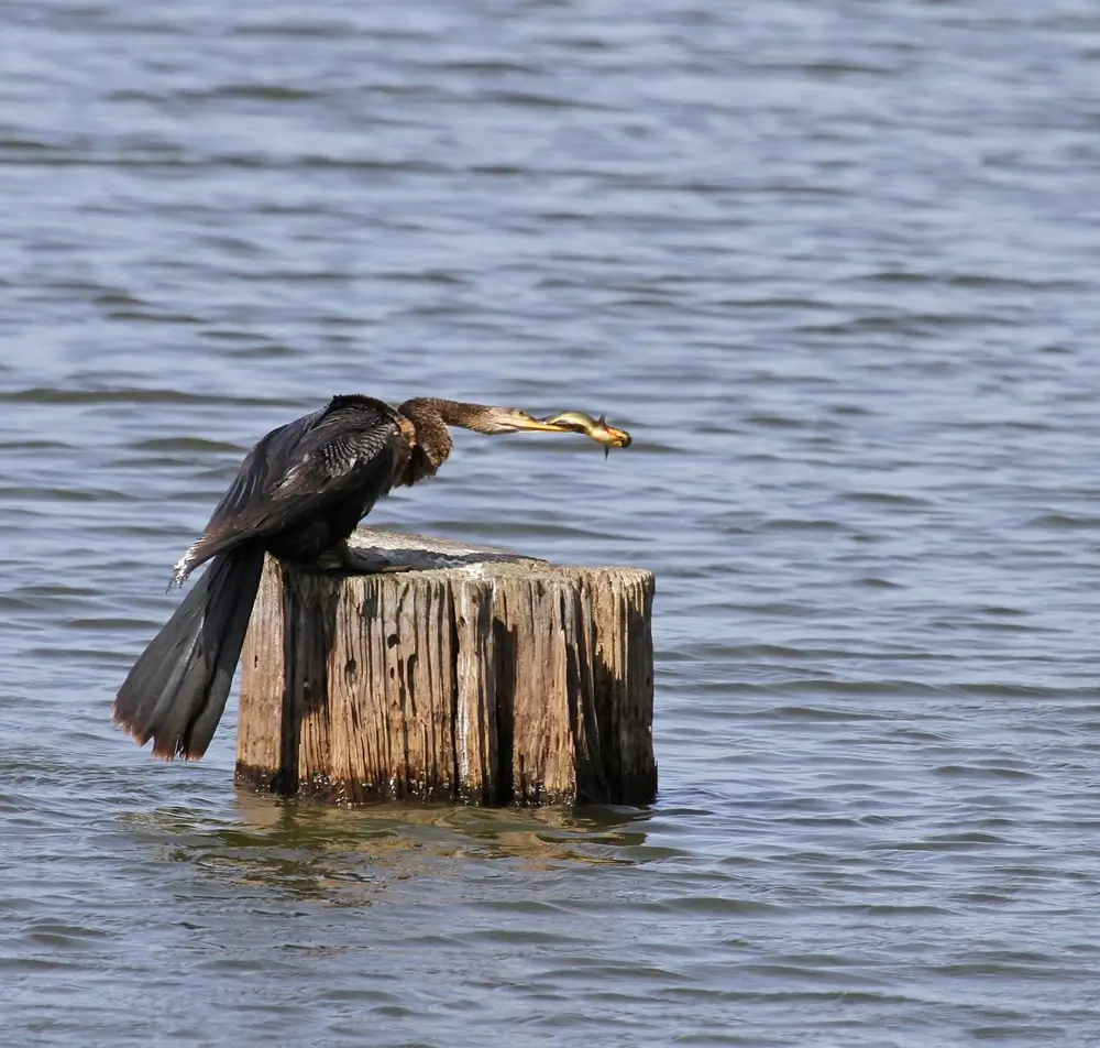 Using its sharp bill, the anhinga spears fish, flips them in the air, and swallows them head-first. Sometimes, the anhinga spears a fish so hard that it has to return to shore with the fish still stuck on its bill. The anhinga bangs the fish against a rock to get it off its bill.