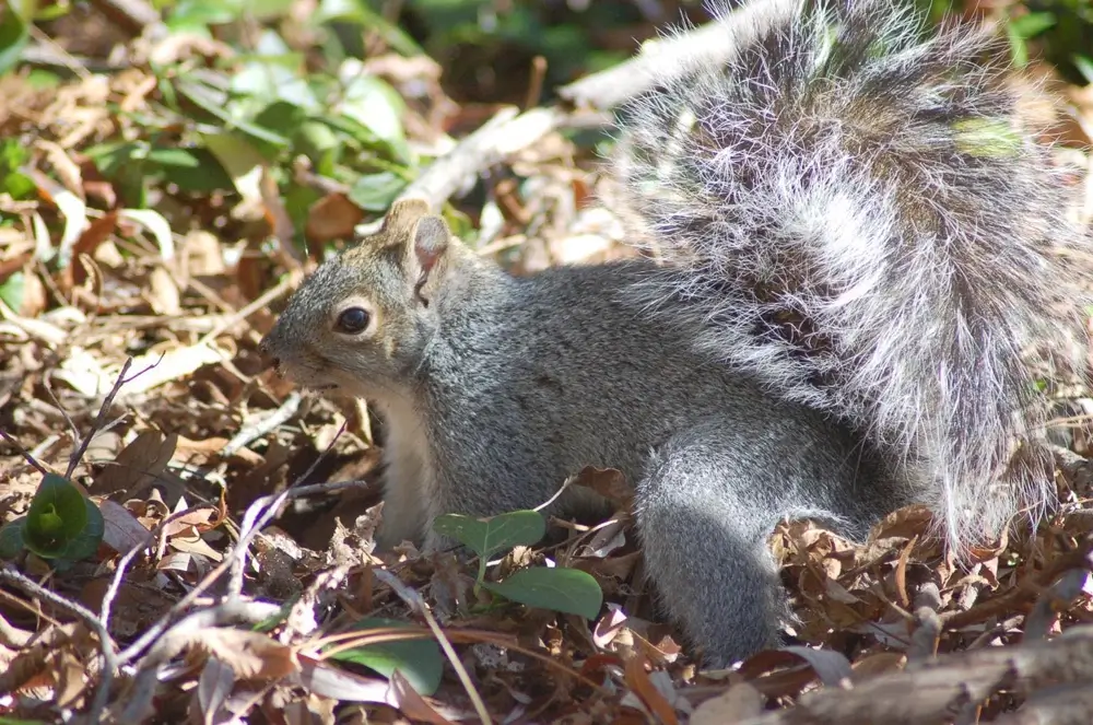 The Arizona gray squirrel has gray fur on its uppersides and a white to cream belly. It has long ears with no tufts and a fluffy tail edged in white.