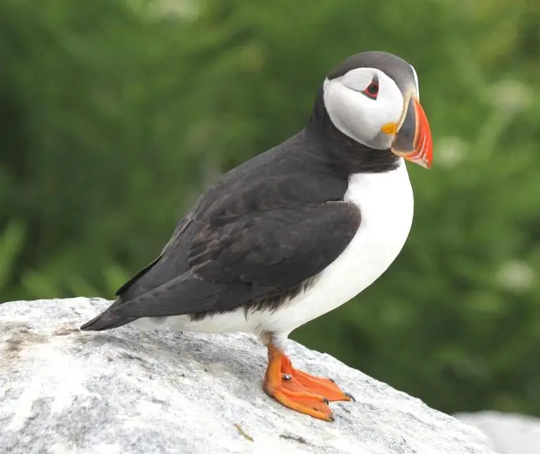 It is black on its uppersides and white on its chest and belly. It has bright orange webbed feet; a white face and cheeks; and a large, triangular parrot-like bill that is bright red and yellow.