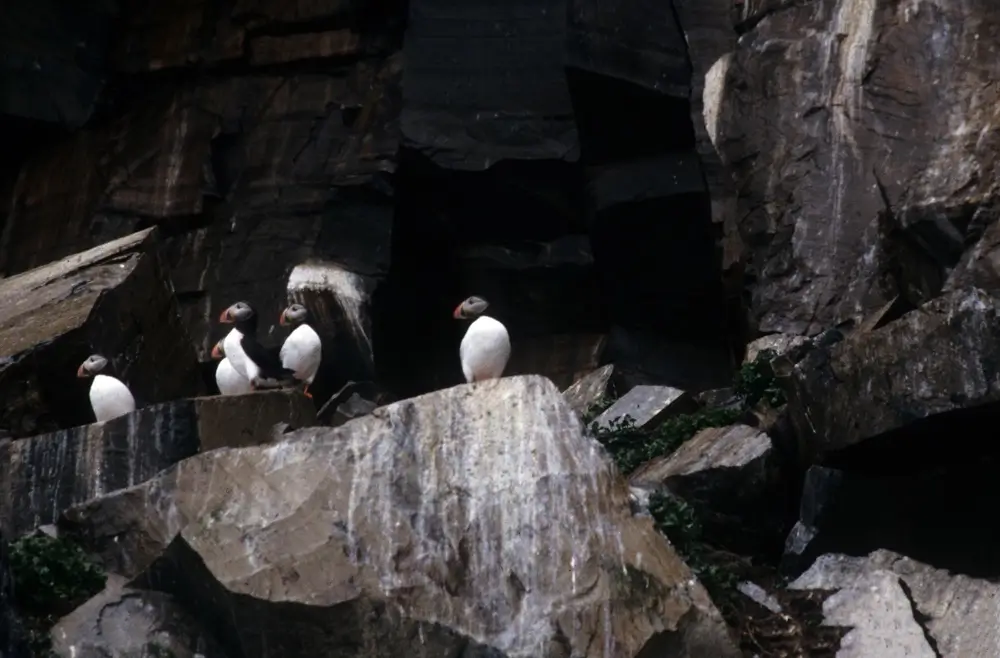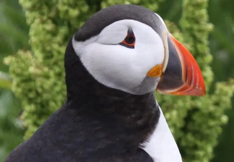 After the breeding season, some of the bill’s outer horny plates fall off, and the bill is smaller and duller. The puffin’s white face also becomes darker after the breeding season.