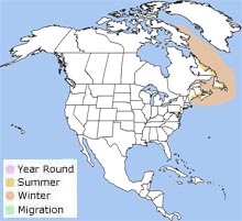 The Atlantic puffin breeds along the Atlantic Coast from the Canadian Maritimes south to Maine.