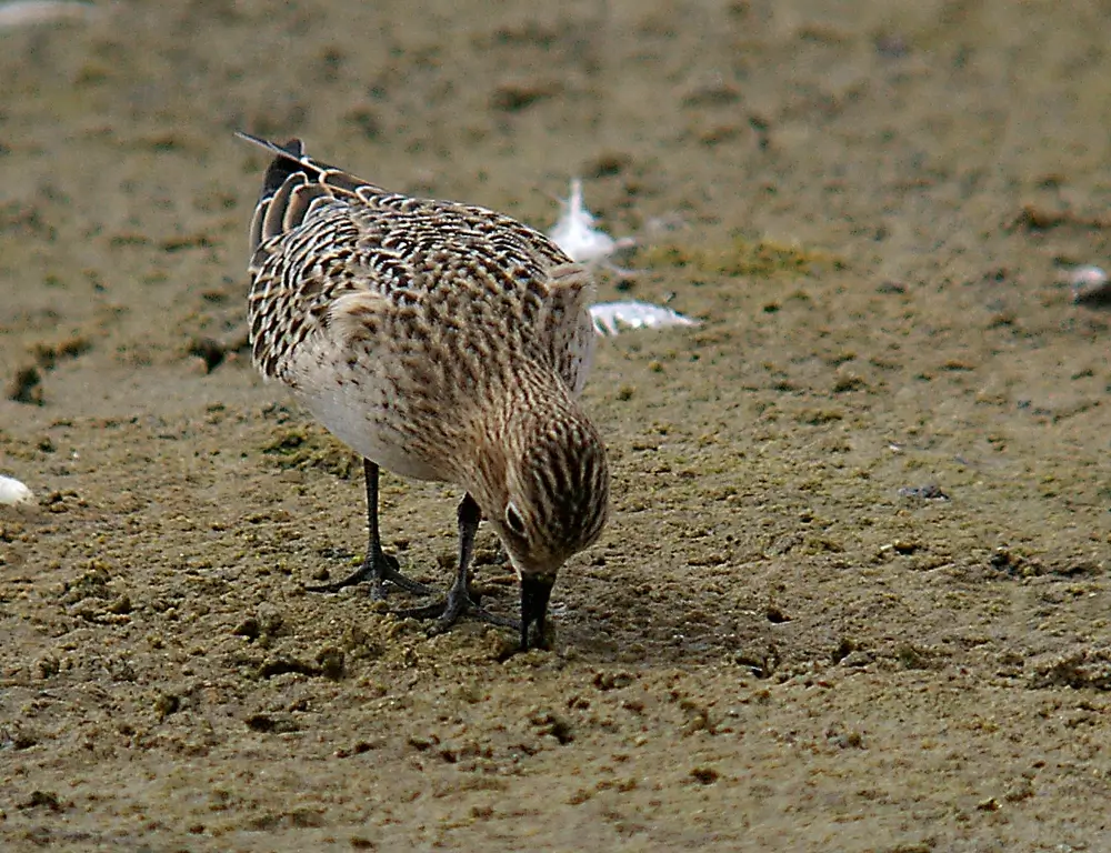 It has a medium-sized, straight, thin bill; a short neck; a round head; long black legs; and wings that extend beyond its tail. It is white on its undersides and lightly marked with grayish-brown on its neck and breast.