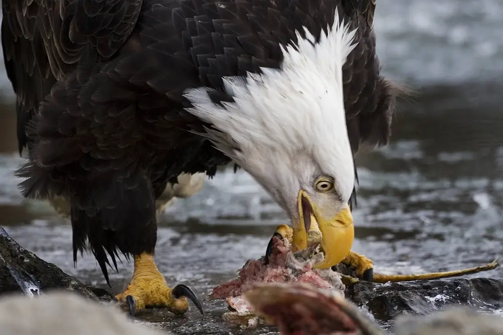 The bald eagle is a fish eater, although it also eats birds, small mammals, and carrion. It has excellent eyesight and spots its prey from a high perch or from the sky.