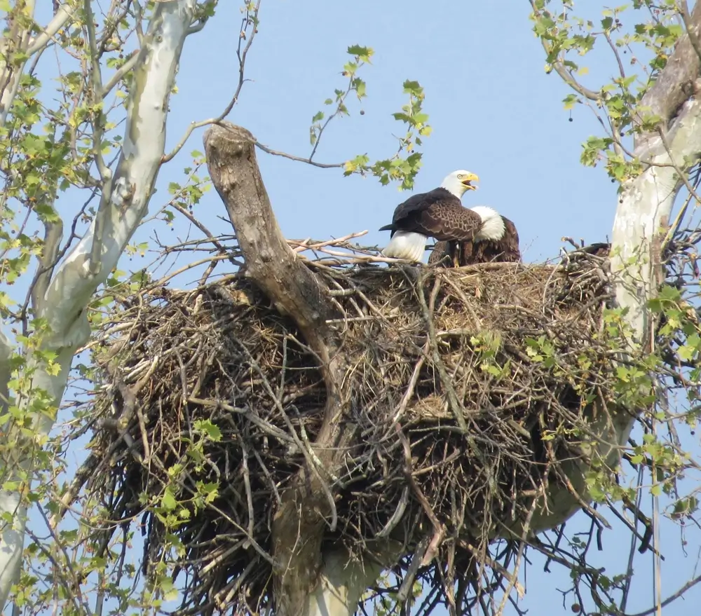 The female bald eagle lays 2 or 3 eggs in an enormous nest made of sticks placed in a tall tree or sometimes on a cliff top. Bald eagle pairs mate for life and use the same nest year after year. They add new sticks each season. Eagle nests can be up to six feet (1.8 m) across and eight feet (2.4 m) deep and weigh hundreds of pounds.