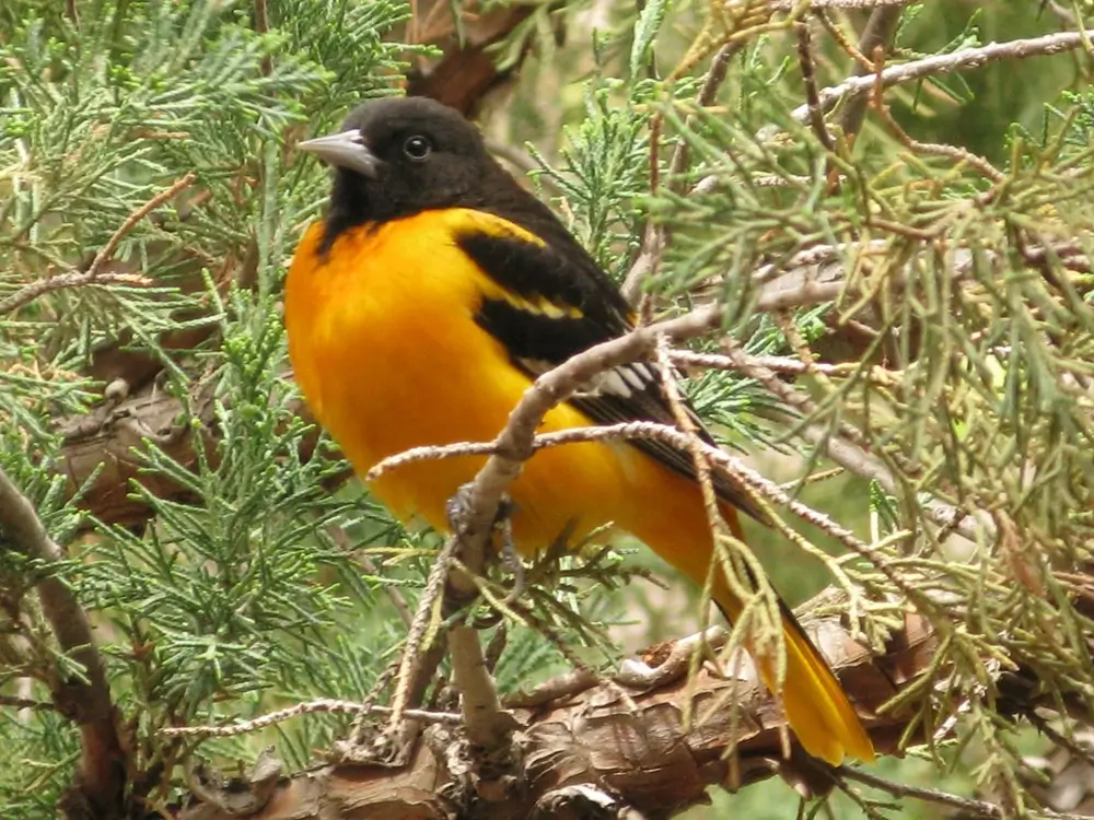 The Baltimore oriole takes its name from the family colors, orange and black, of Cecil Calvert, Lord Baltimore, who founded the colony of Maryland as a refuge for English Catholics.