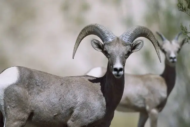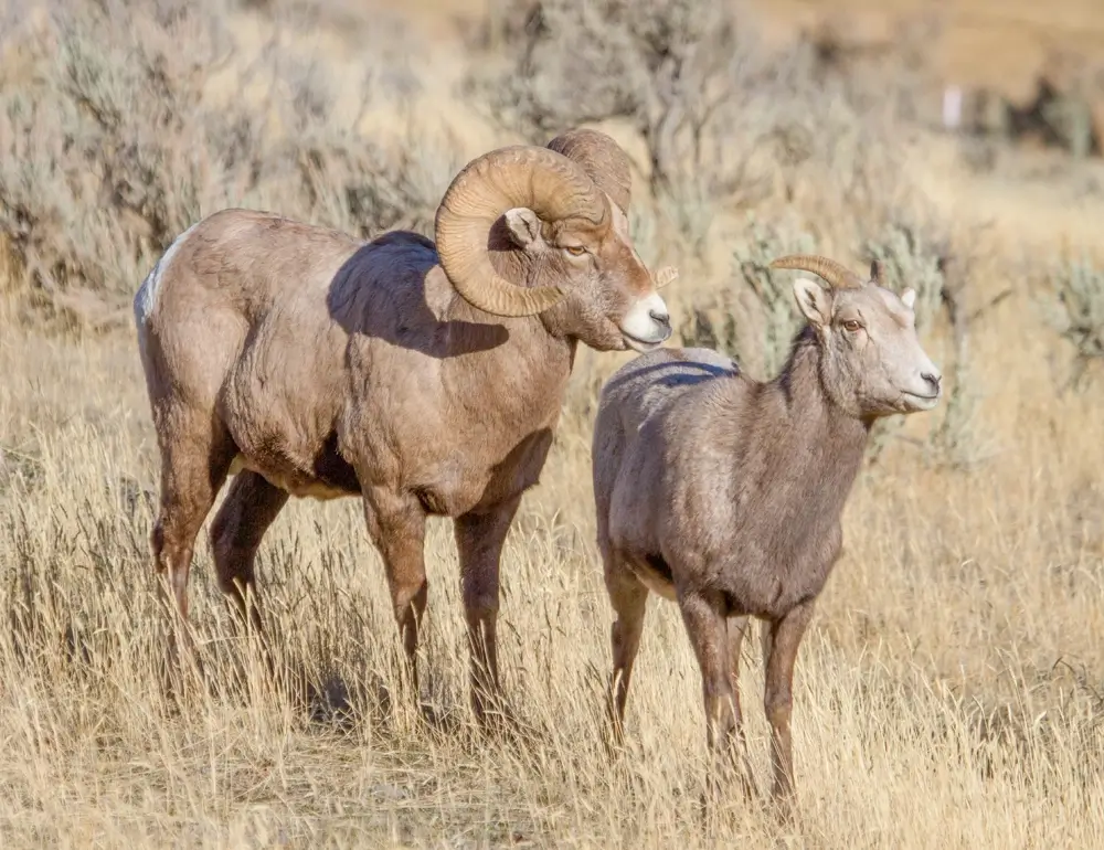 The bighorn sheep has tan or brown fur. It has a white belly, rump, and muzzle. It is best known for its large horns. The ram has large, thick, curving horns. The ewe’s horns are more slender and less curved.