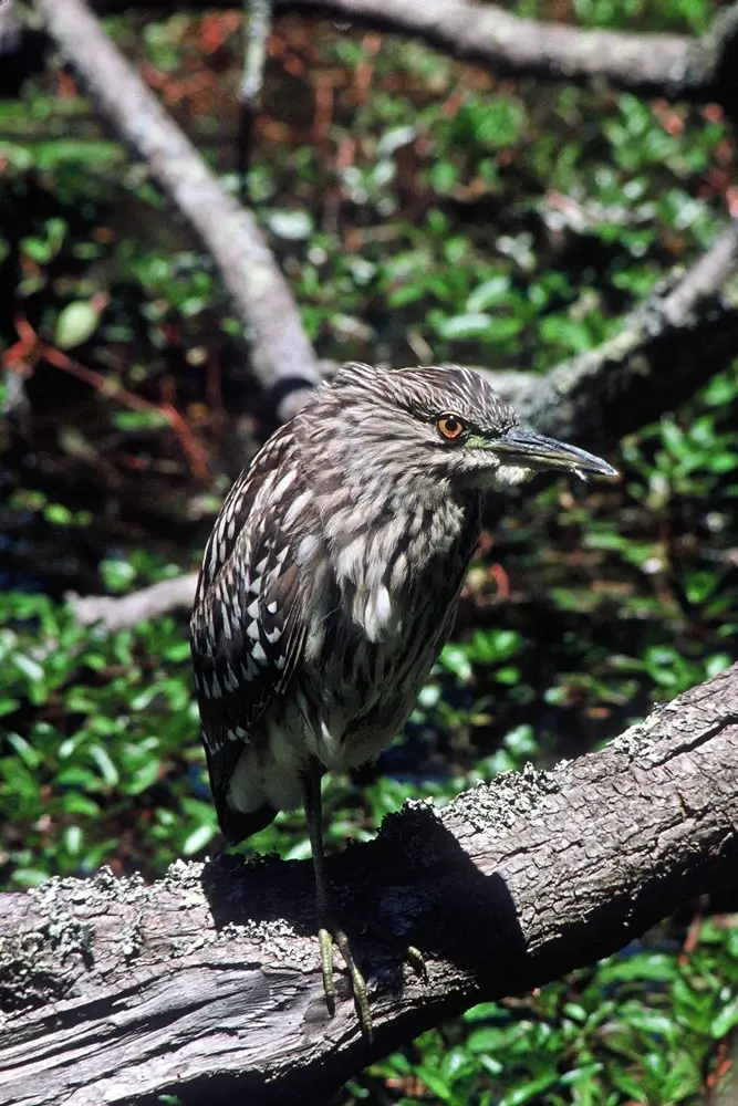 Immature night herons have a gray-brown head, chest, and belly streaked with white. Their eyes are yellow, and they have gray legs.
