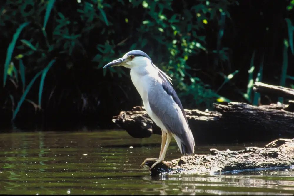 The black-crowned night heron hunts for food in the early morning hours and at dusk. It stands and waits for prey like frogs and fish to pass by and then snatches them up with its bill.