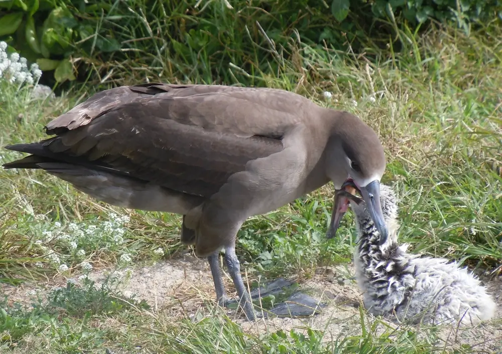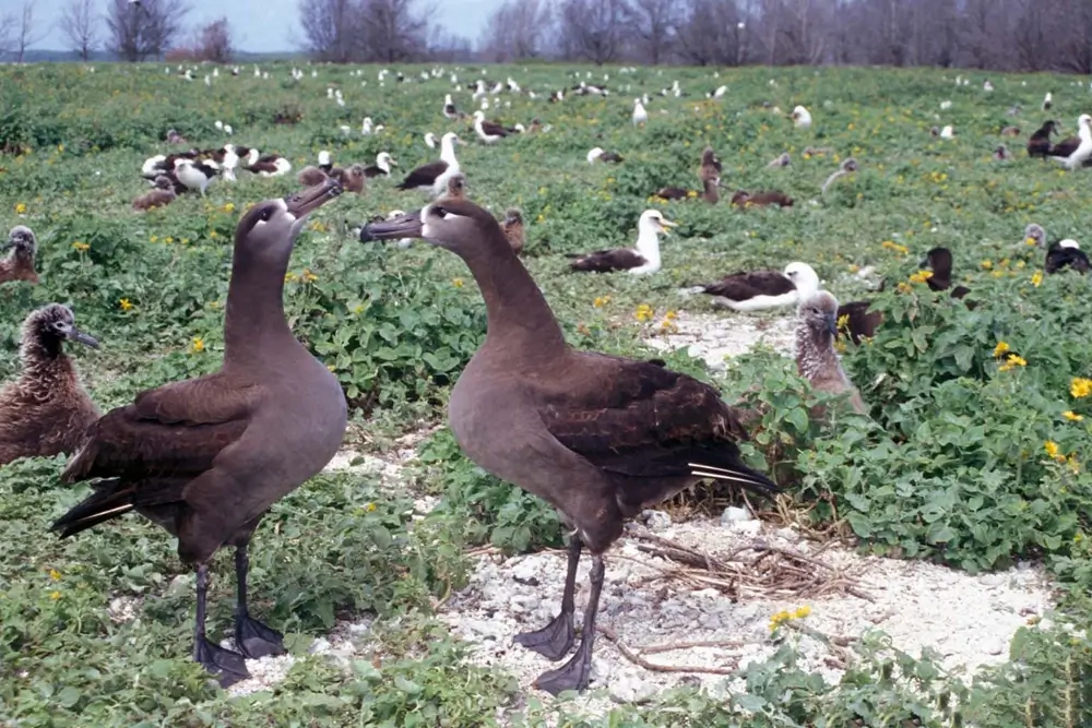 The black-footed albatross nests in colonies on islands. Mating season runs from November to February. Females and males do a mating ritual that involves twining their necks together and flapping their wings.