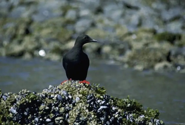 In the summer, the black guillemot nests in crevices on rocky shores. During this time, it stays close to shore, feeding in shallow water.