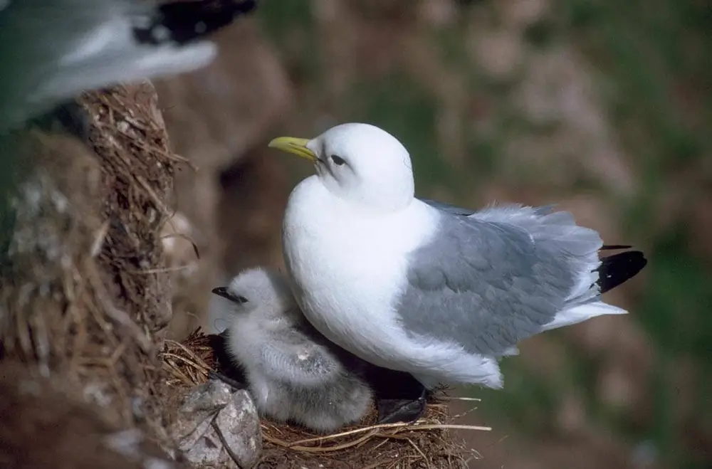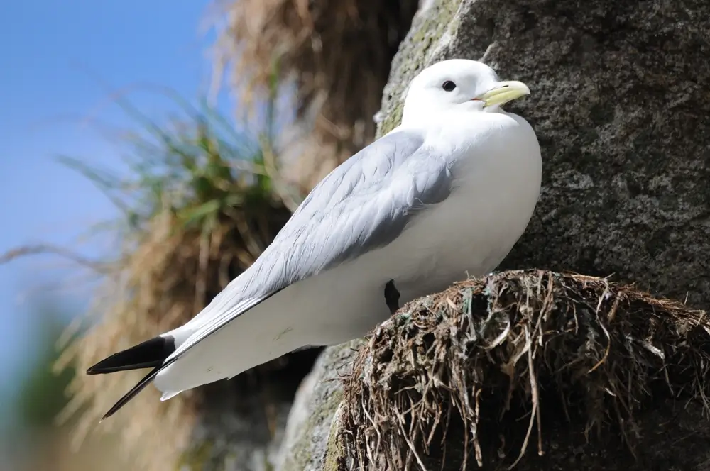 The black-legged kittiwake nests in huge colonies that can include thousands of birds. The black-legged kittiwake male returns to the same nesting site year after year. Male and female pairs may mate for more than one season.