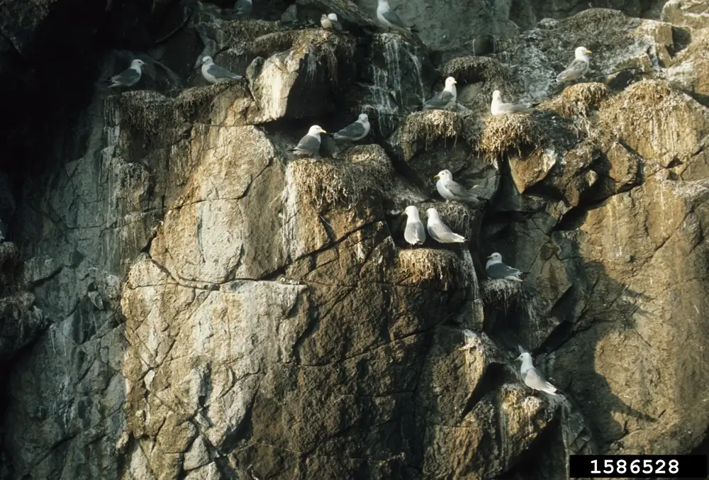 The black-legged kittiwake is found on cliffs and ledges of coastal areas and islands during the breeding season. The black-legged kittiwake may also nest on tall buildings, bridges, sea walls, and even offshore oil rigs. It winters on the open ocean. It rarely comes far inland.