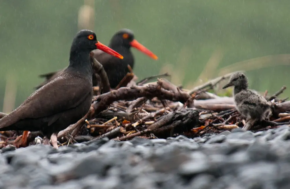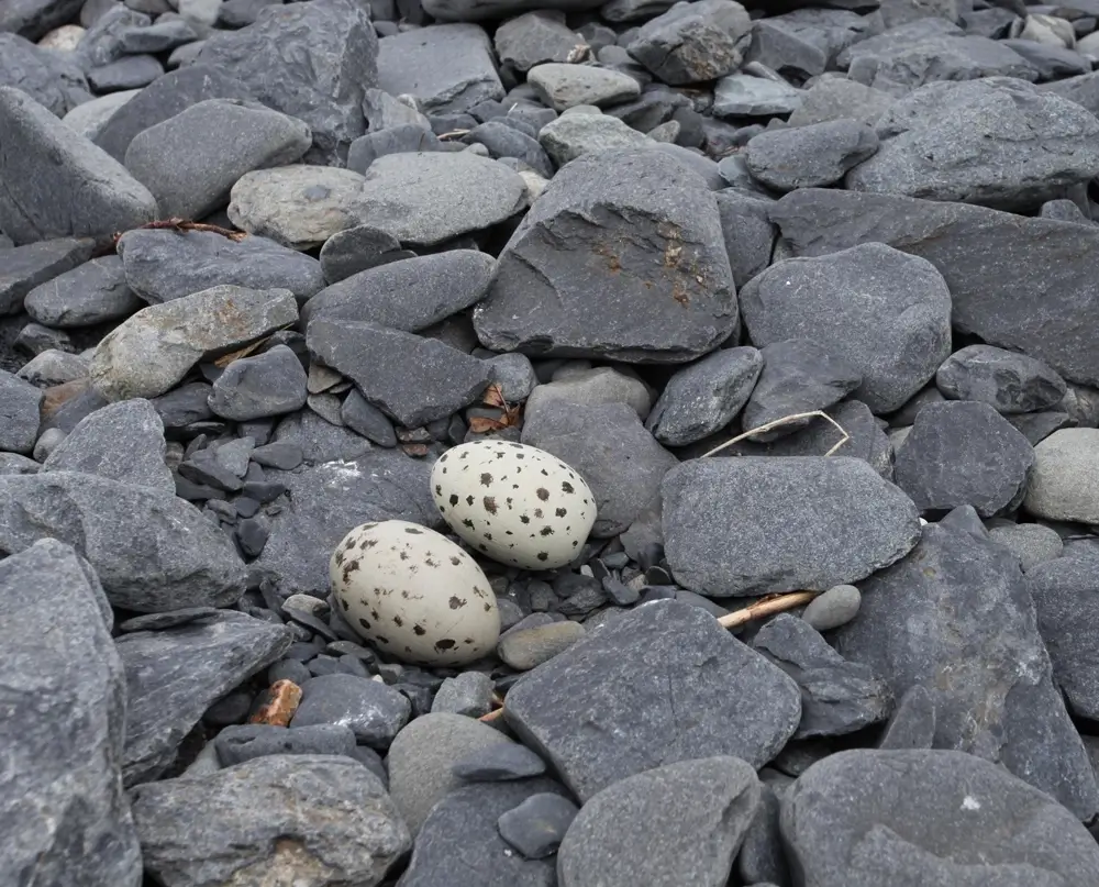 The female black oystercatcher lays two to three eggs among pebbles in a shallow, rocky depression, or in a hollow on the beach above the high tide line. The male and the female build the nest together.