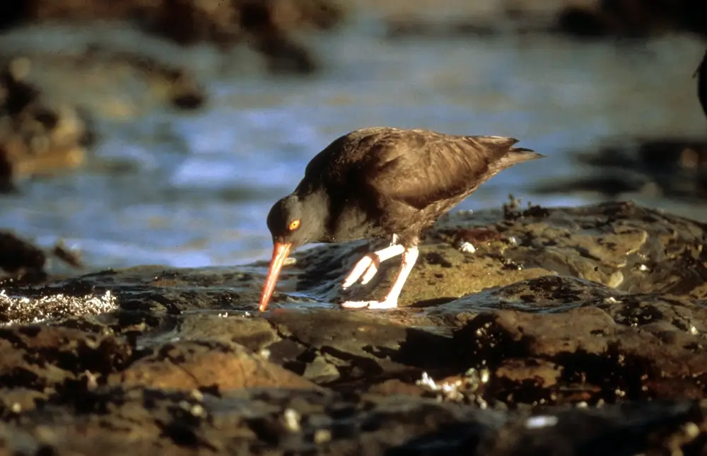 It especially likes to eat creatures that cling to the rocks below the high-tide line. It usually forages at low tide and rests at high tide. It uses its long, sharp bill to pry bivalves like limpets and mussels off the rocks and then uses its bill to open them.