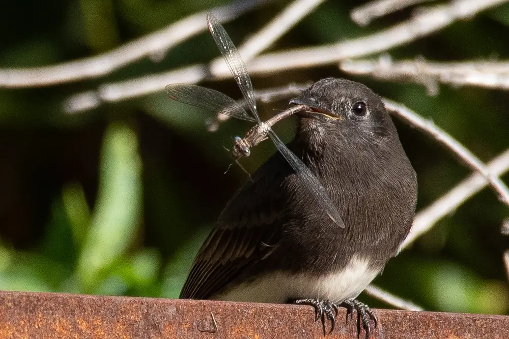 The black phoebe primarily eats insects. It perches on a shady branch waiting for insects to fly by. It then swoops after the insect and catches it in mid-air. It sometimes also hovers over the ground waiting for prey.