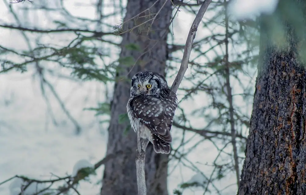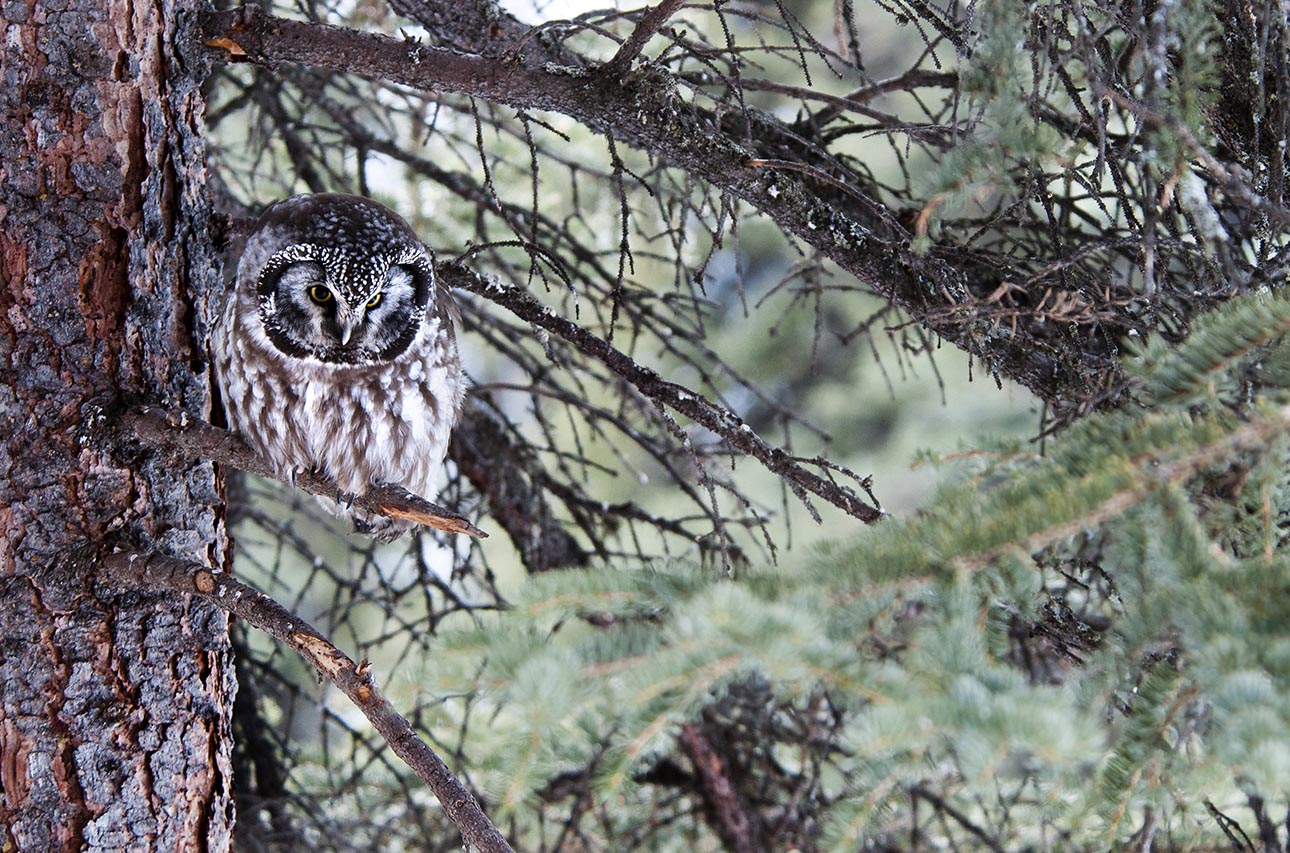 Hunting from a protected perch, the boreal owl swoops down and grabs its prey with its long talons. During winter and breeding season, the boreal owl caches, or saves, its food in its nest or in the crook of a tree.