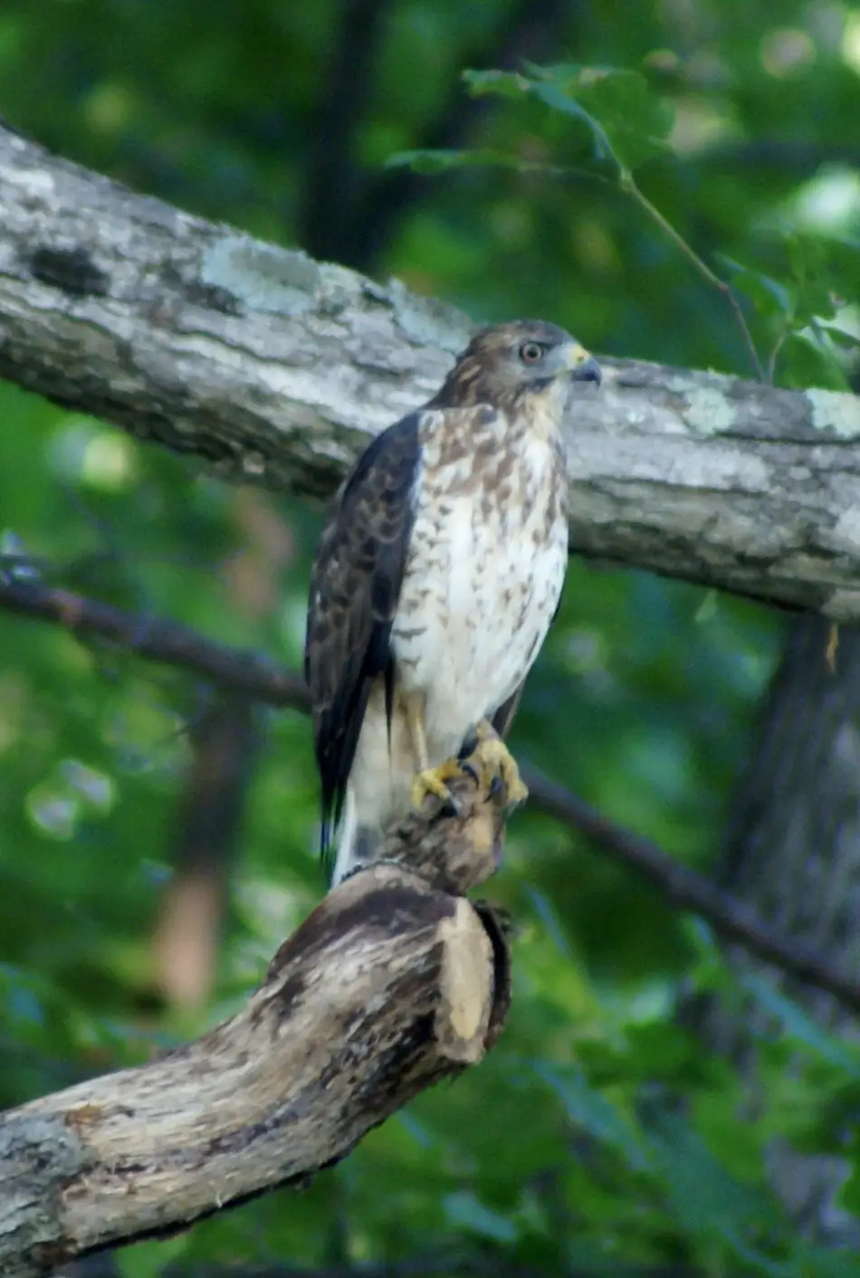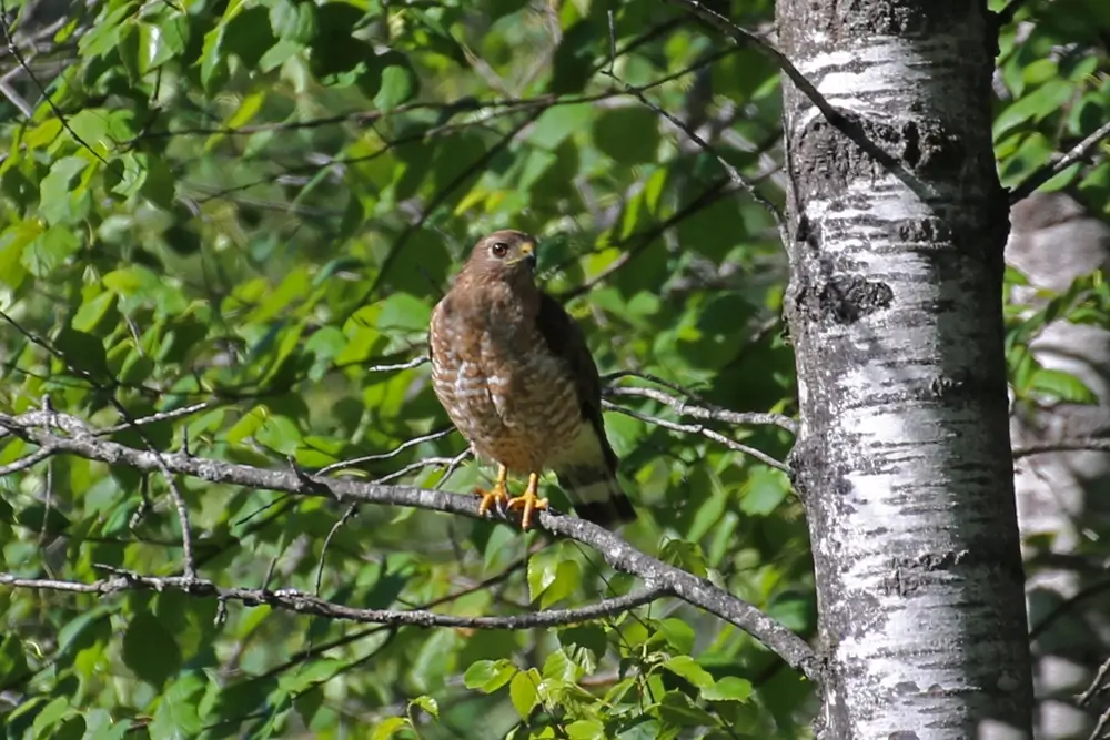 During breeding season, broad-winged hawks are hard to spot. They stay beneath the canopy, perched in trees hidden by foliage. You are more likely to know they are in the forest by their “pe-heeeeee” call.