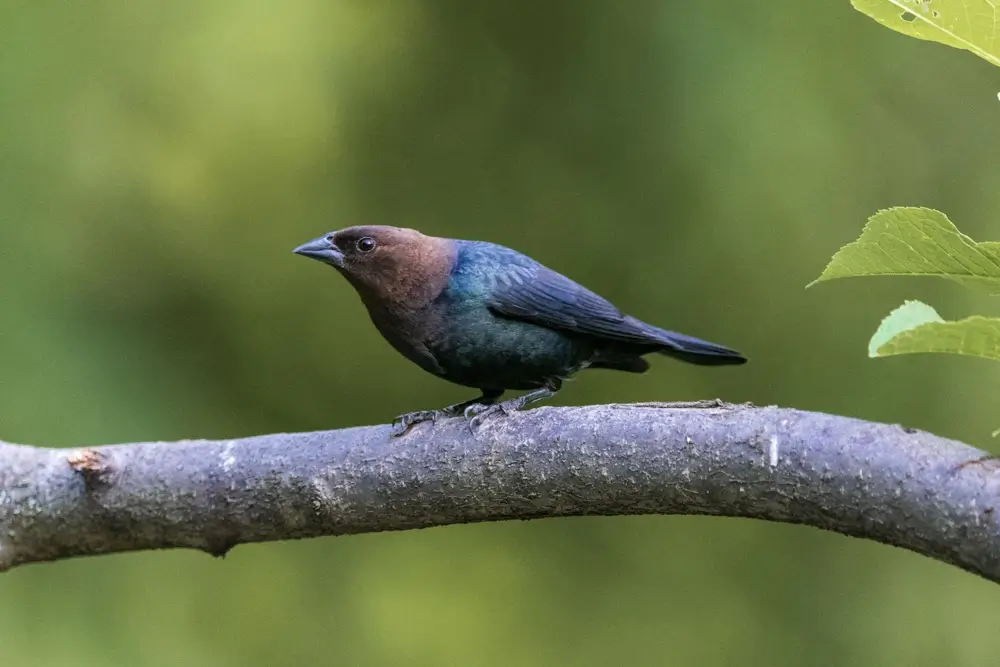 The male brown-headed cowbird has a shiny black body and a brown head. The female is entirely brown.