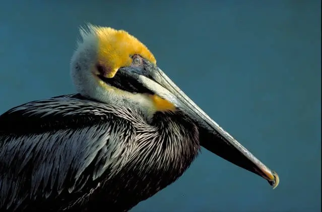 The brown pelican has a very long gray bill with a large pouch of skin. Its pouch holds two or three times more than its stomach can hold — close to three gallons (11.4 liters) of fish and water.