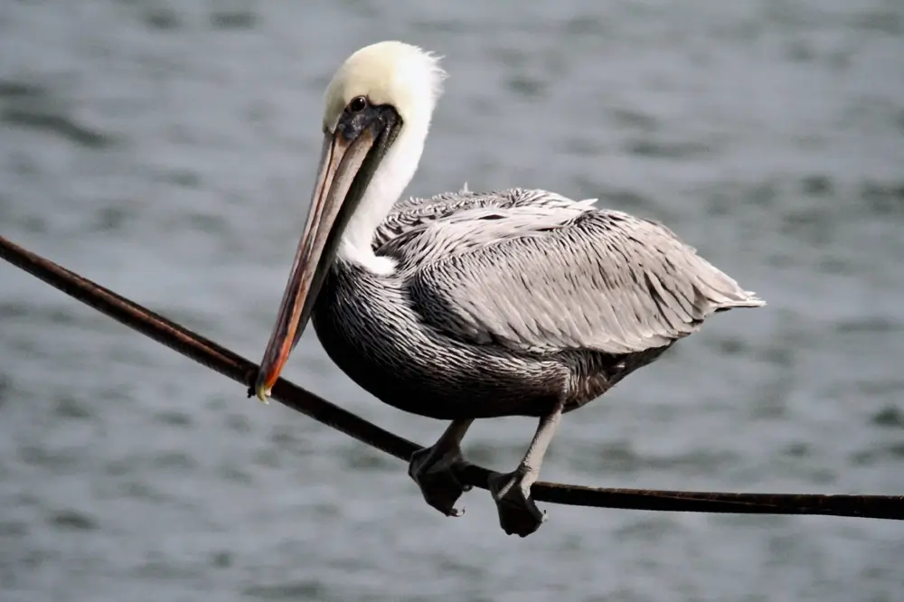 It doesn’t carry fish in its pouch; it only uses the pouch to scoop up fish. Sometimes gulls will try to steal fish from the pelican’s pouch. In fact, they even perch on the pelican’s head and wait for just the right moment to grab a fish.