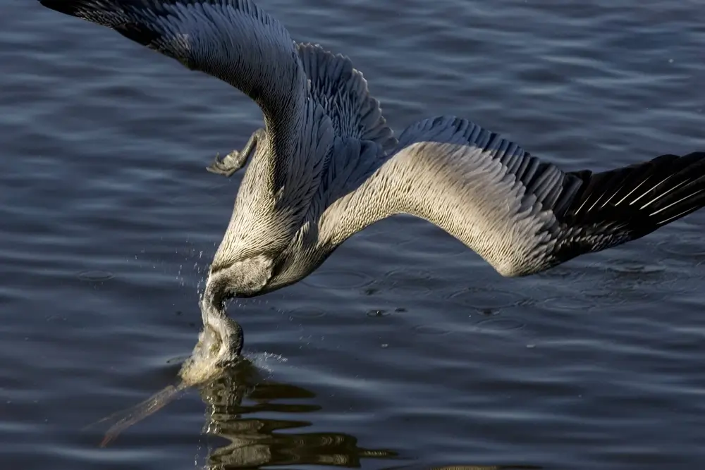 The brown pelican is a plunge diver. It drops from the air with its wings partly folded and dives into the water to catch its prey. It is the only species of pelican that does this.