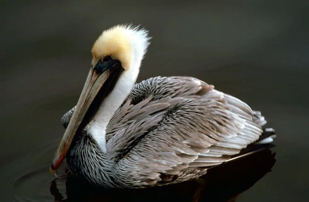It has a brown and gray body and a white head with a light brown crown. Its neck is dark brown during the breeding season. Young pelicans are all brown.