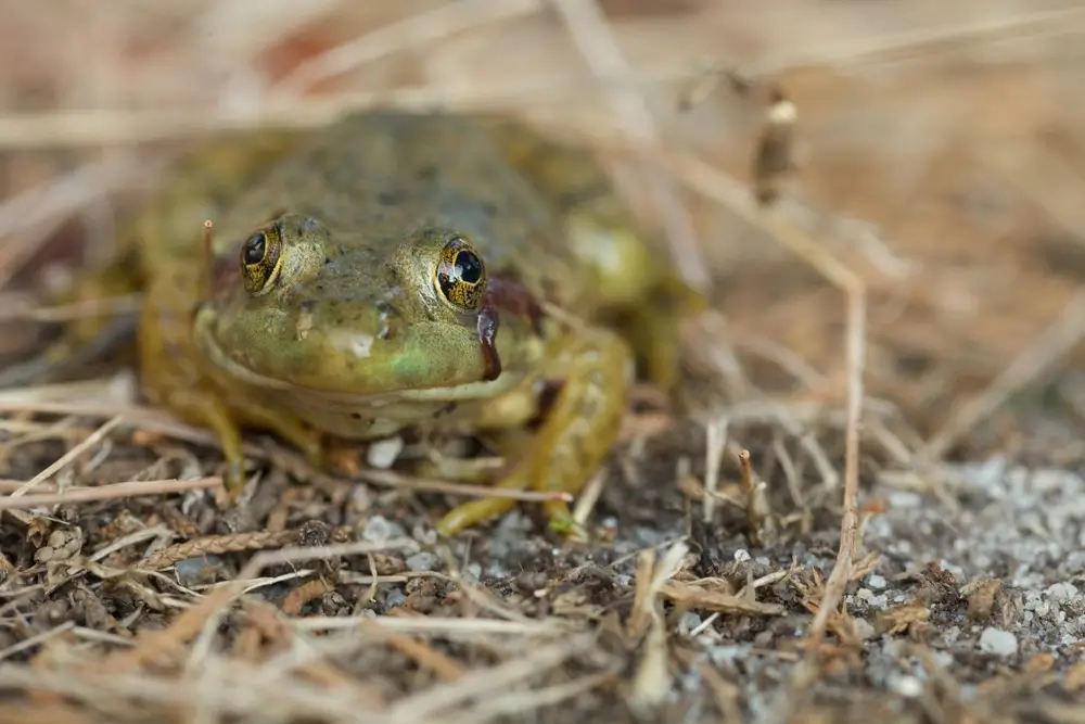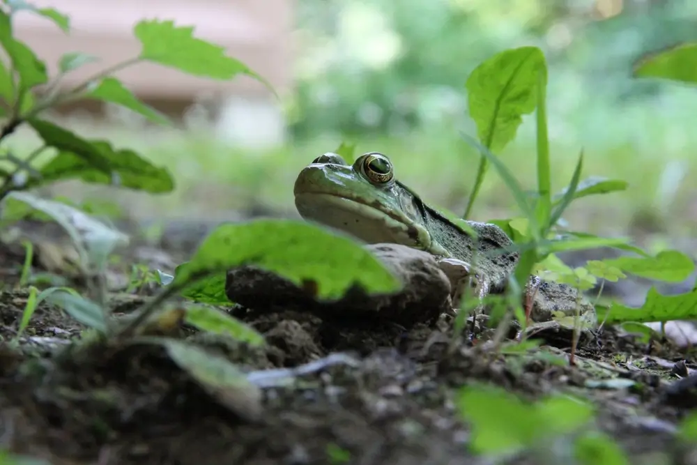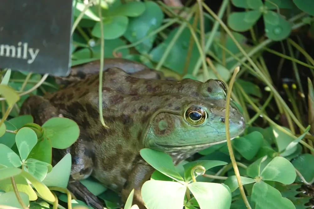 It has webbed rear feet and powerful rear legs that help it leap as far as 3-6 feet. It has large tympanums on the side of its head. The tympanum is a circular external eardrum. In males, the tympanum is larger than the bullfrog’s eye. In females, it is the same size or smaller than the bullfrog’s eyes. The bullfrog does not have dorsolateral ridges. Dorsolateral ridges are the ridged lines that run down the backs of most species of frogs.