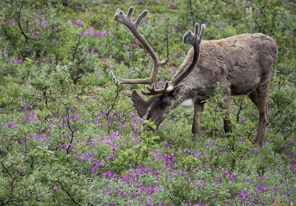 The caribou eats lichens, mushrooms, grasses, sedges, flowering tundra plants, the twigs of birches and willows, and fruit.