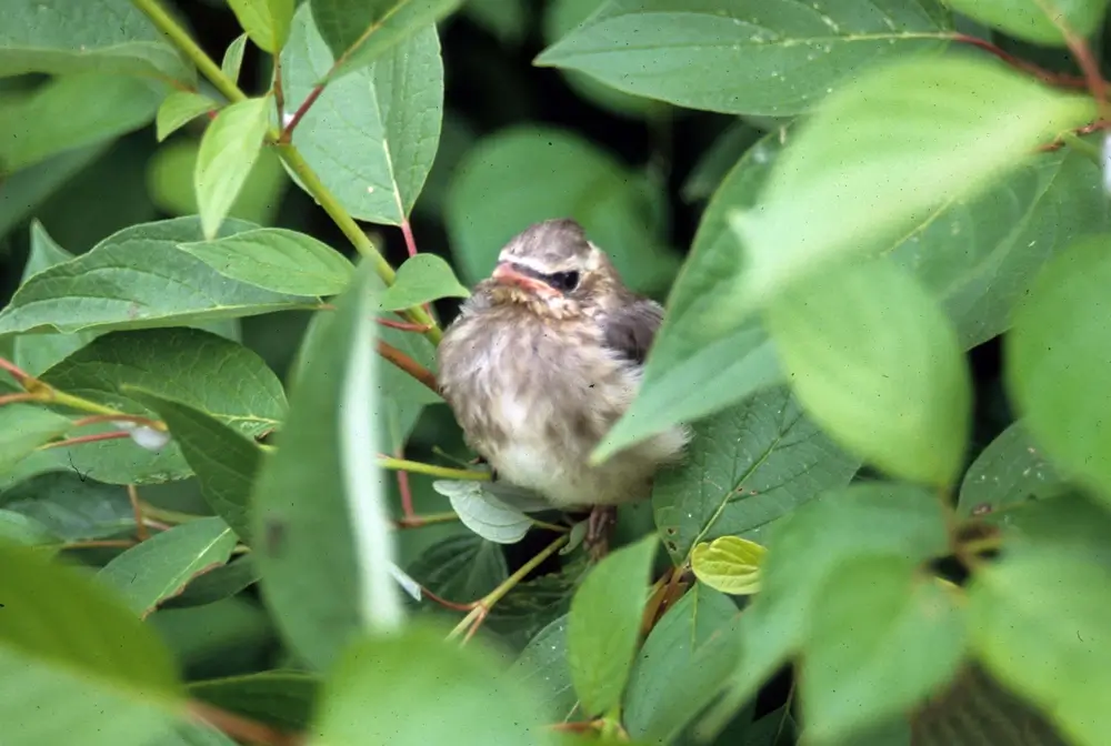 The nest is cup-shaped and made of bark, twigs, moss, and grass. The nest is usually made in a conifer tree. The female cedar waxwing lays four to six eggs. She incubates the eggs for about 12 days. The male brings her food and guards the nest while she incubates the eggs. The chicks are born blind and naked. Both parents feed the chicks.