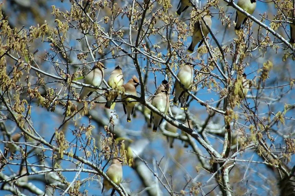 Cedar waxwings are very social birds. They are non-territorial and often groom each other. They travel in flocks of 40 or more birds. They often appear in a spot with a good crop of berries. When they have eaten all the berries, they move on.