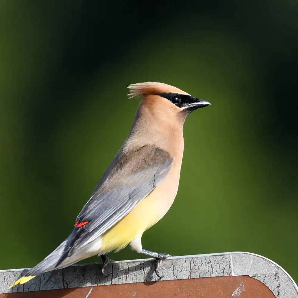 It is brown on top and pale yellow on its belly. It has a crest of feathers on its head and a black mask lined with white on its face. The cedar waxwing has black legs and feet and a short black bill. It has darker gray wings with short, waxy red tips. Its tail has a yellow tip.