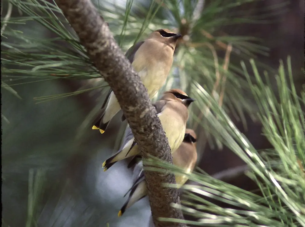 The cedar waxwing lives in open woodlands, orchards, and residential areas, especially those with fruit-bearing trees and bushes.