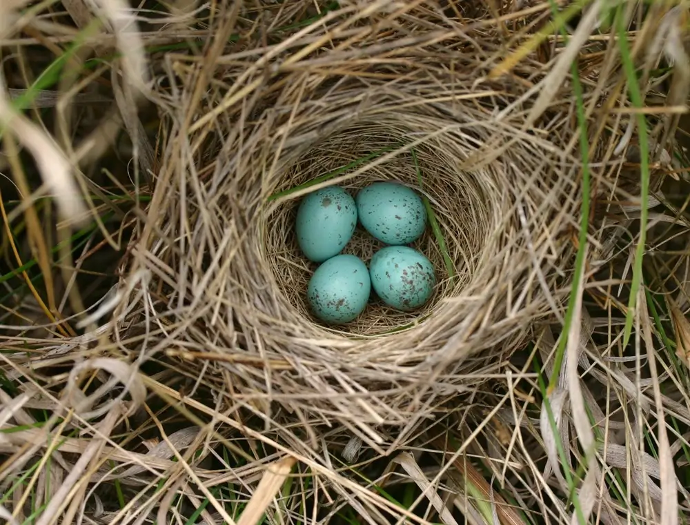 The male clay-colored sparrow reaches the breeding territory first. He sings to attract a mate and defend his territory. The female builds an open-cup nest of twigs, weeds, and grass.