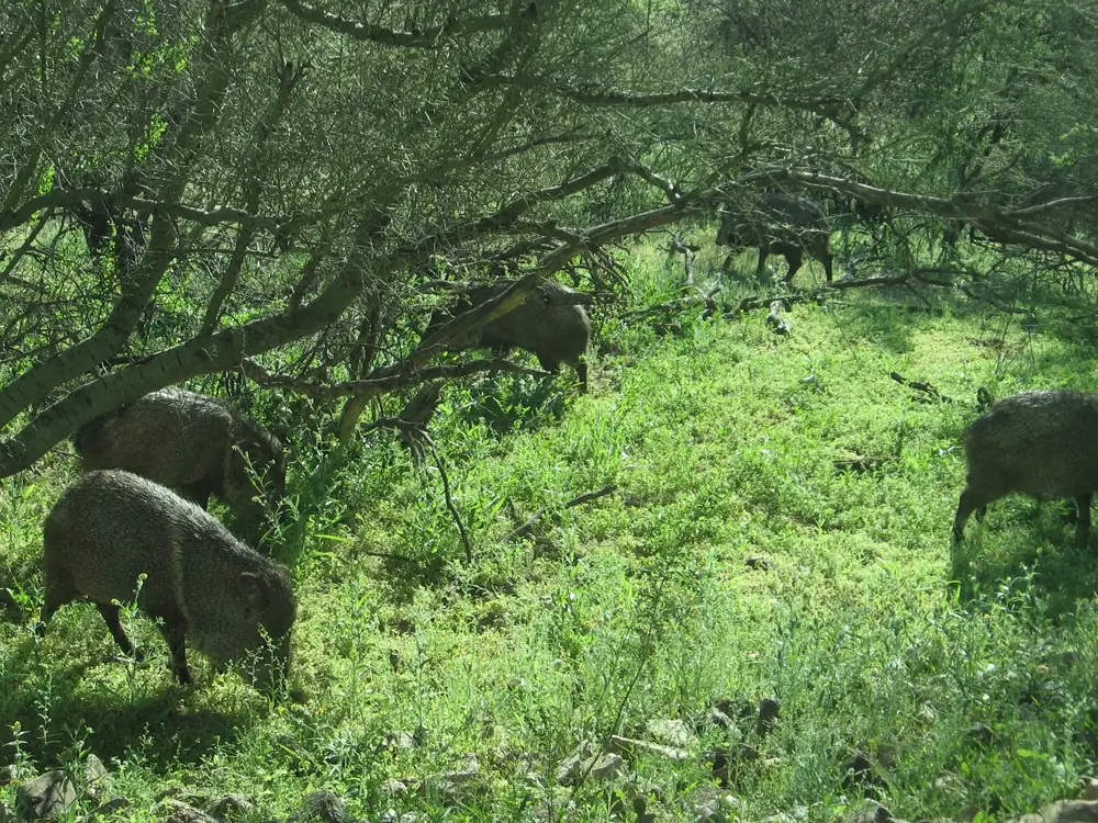 The collared peccary lives in brushy desert areas and rocky canyons. It is usually found near a water source.