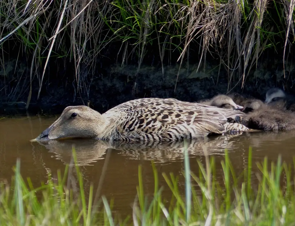 The ducklings fledge when they are about two months old. Young eider ducklings may gather in groups or crèches where they are cared for by non-breeding female eiders. Gathering in large groups helps protect the young eiders from predators.